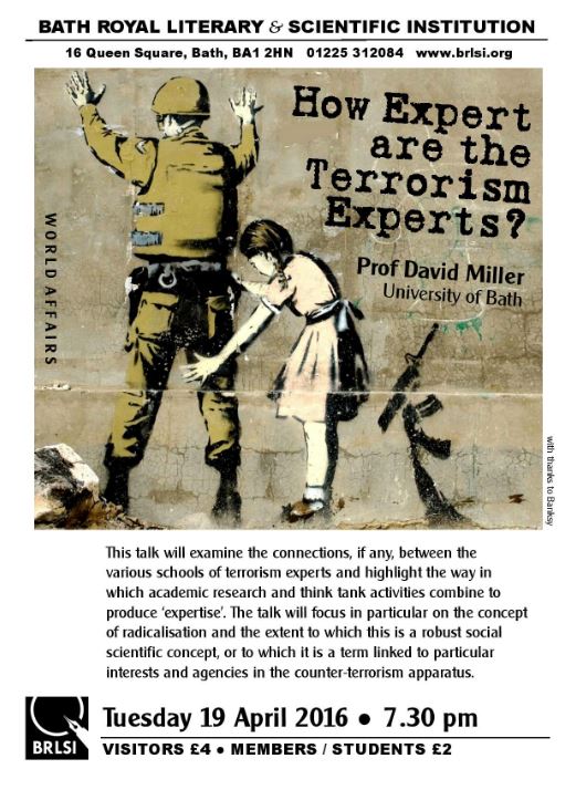 - David Miller spoke at 'How Expert Are the Terrorism Experts?', Bath Royal Literary & Scientific Institution (19 April 2016).